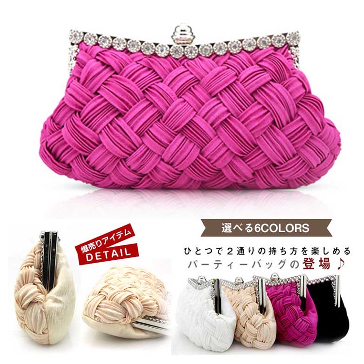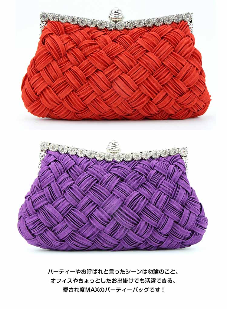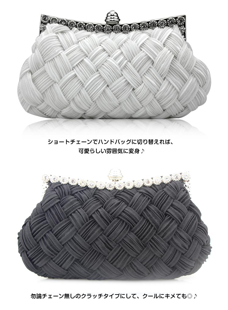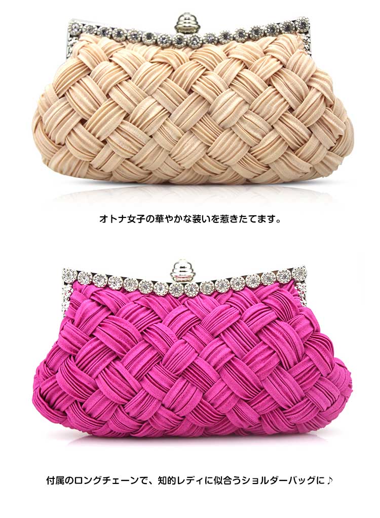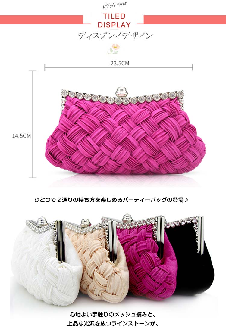 | ひとつで2通りの持ち方を楽しめるパーティーバッグの登場♪心地よい手触りのメッシュ編みと、上品な光沢を放つラインストーンが、オトナ女子の華やかな装いを惹きたてます。付属のロングチェーンで、知的レディに似合うショルダーバッグに♪ショートチェーンでハンドバッグに切り替えれば、可愛らしい雰囲気に変身♪勿論チェーン無しのクラッチタイプにして、クールにキメても◎♪パーティーやお呼ばれと言ったシーンは勿論のこと、オフィスやちょっとしたお出掛けでも活躍できる、愛され度MAXのパーティーバッグです! | |