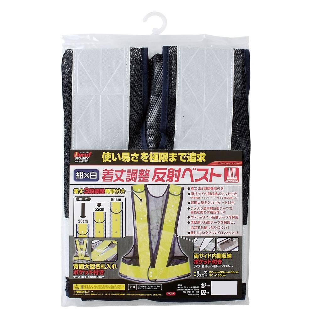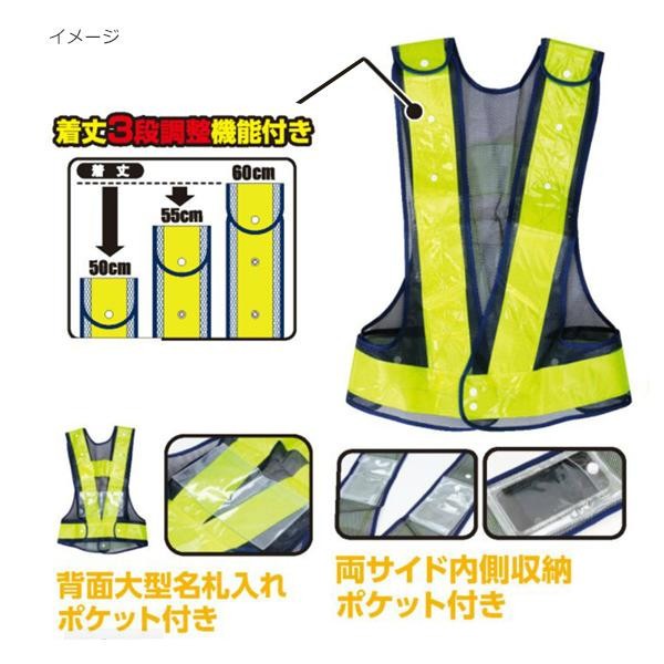 | 着丈を50cm・55cm・60cmの3段階に調整可能!!破れにくいダブルナイロンメッシュのベストです。両サイド内側にはスマホなどを入れられる収納ポケット、背面には大型の名札入れ付き。ラメ入りの再帰反射テープは幅7cmのワイドタイプで昼夜問わず視認性も◎!!柔軟剤入りテープなので、低温でも硬くなりにくい仕様です。 |