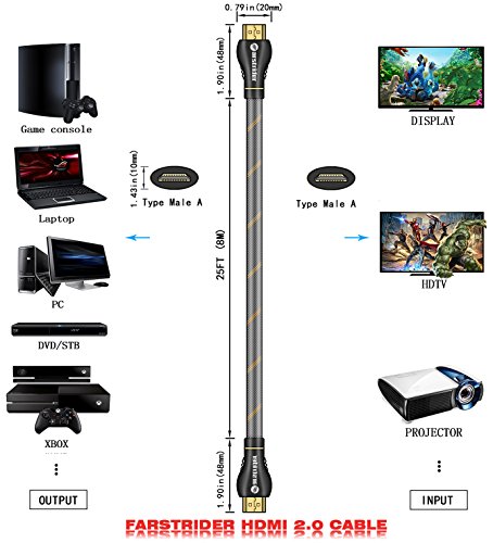 FARSTRIDER HDMI 2.0 Version Super High Quality Cable v1.4a with 3D Technology and Audio return(ARC)/CAT-2 HDMI Cable(Full 1080p/2160p approved),Full Ultra HD 4k support - 2160p (4096 X 2160 pixels),extended colour spaces such as xv Colour and Deep Colour.Supports 720p, 1080i,1080p and 2160p also Supports 4K x 2K Video and more color spare,Supports 54-Bit Deep Color for a Crispy Image.Supports True HD Dolby 7.1 and DTS-HD Master Audio,Support for all television with 1000Hz rates and above.