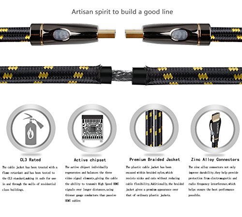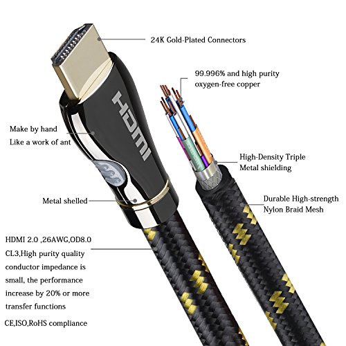 High-Speed HDMI Cable features 24K gold-plated, 99.996% and high purity oxygen-free copper, corrosion-resistant connectors that deliver optimal signal transfer with lower distortion at the point of contact. Ultra-high speed lossless audio and video transmission,This dedication to the digital signal provides sound and picture quality that is truer to the original. high quality PVC, Tough braided exterior outer layer and shielding, purity of the digital signal and longer service life.