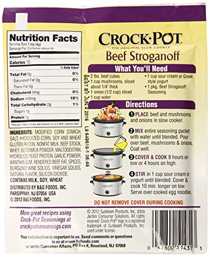 -. Binding : Grocery -. Brand : Crock-Pot -. Feature : Wholesome ingredients you can combine to make the perfect beef stroganoff / All your favorite spices make for a delicious family meal / Add this seasoning mix to your tender ground beef / Easy to prepare / Rich in flavor -. Label : B & G Foods -. Manufacturer : B & G Foods -. NumberOfItems : 12 -. PackageQuantity : 1 -. ProductGroup : Grocery -. ProductTypeName : GROCERY -. PublicationDate : 2015-01-14 -. Publisher : B & G Foods -. ReleaseDate : 2015-01-14 -. Size : 1.5 Ounce -. Studio : B & G Foods -. Title : Crock Pot Seasoning Mix, Beef Stroganoff, 1.5 Ounce (Pack of 12)
