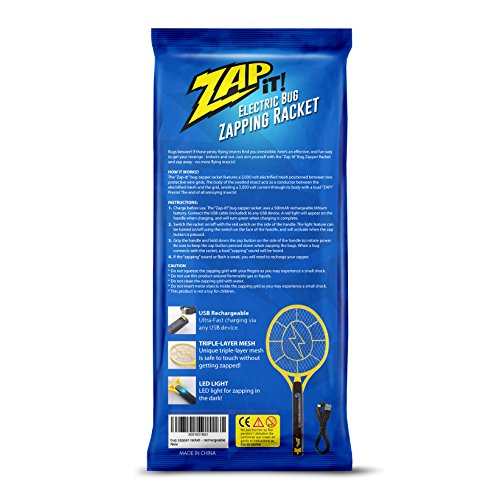 Once the prey, now the hunter! Turn the tables on those pesky bugs with the revolutionary Zap-It Bug Zapper, an electronic fly swatter guaranteed to take the acrobatics out of eliminating all types of flying insects. Whenever you encounter a bug that just needs to move along, simply swing the Zap-It electric bug zapper in its path, press the activator, and zip-pop! Bye-bye, bug!With ultra-fast charging via any USB device, it's super easy to make sure your bug zapper fly swatter is always ready for the next aggravating pest. If you should feel the need to zap after dark, a super-bright LED light will illuminate the scene. Keep a Zap-It electric bug zapper racket handy wherever you are. Once you discover the ease and convenience of this powerful handheld electric bug zapper, you will want a fly swatter zapper in the kitchen, the garage, your car and everywhere else you go.