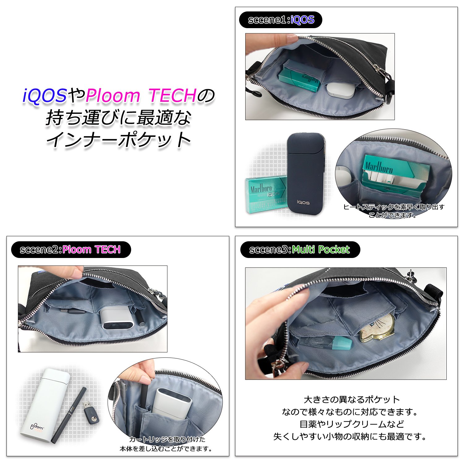 The zipper pocket at the front and the open pocket that is best for carrying the electronic cigarette (iQOS / Ploomtech) at the inner are provided.