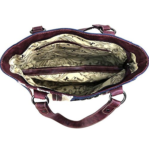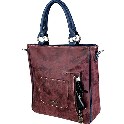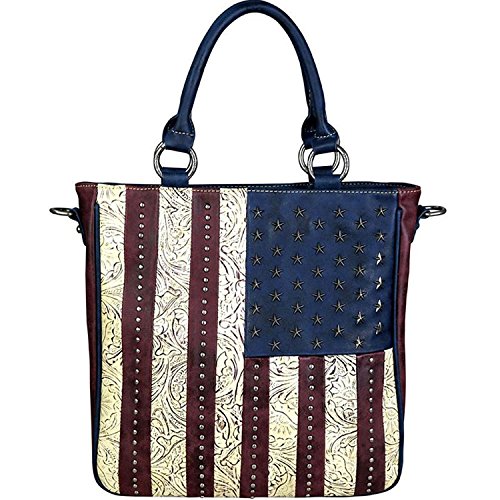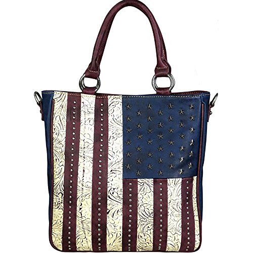 Product Description Made of PU leather (distressed color) , this tote/messenger has: Patent Protected! US Patent Pending-Patent 1,558,2043 Application Number 1,3867998. Title of Invention: Concealed handgun holster 35 U.S.C 292 American flag colors with tooling Accented with antique silver stars and studs A zipper enclosure on the top of the bag A zippered pocket on the back to conceal the handgun (9.5 x 5.5) Single compartment divided by a medium zippered pocket A zippered pocket on the inside back and 2 open pockets on the inside front An open pocket on the back Metal feet on the bottom for protection and stability Double handle Detachable and adjustable shoulder strap included 12.5 x 3.5 x 12.5 (Drop 7") (Strap 44") 0