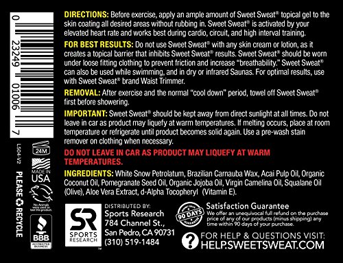 -. Binding : Health and Beauty -. Brand : Sports Research -. IsAdultProduct : 0 -. Label : Sports Research -. Manufacturer : Sports Research -. ProductGroup : Health and Beauty -. ProductTypeName : HEALTH_PERSONAL_CARE -. Publisher : Sports Research -. Studio : Sports Research -. Title : Sweet Sweat 'Workout Enhancing' Gel | Helps increase circulation, sweating and motivation during exercise | 'XL' Jar - 13.5oz