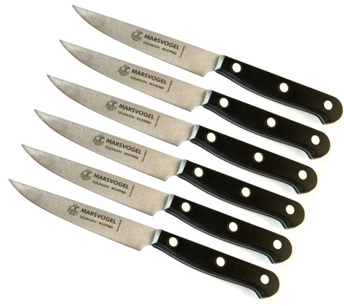 -. Feature : 6 Stück Brotzeitmesser 4 1/2" POM Marsvogel Solingen # 82 45 02 / Die Klinge des Messers überzeugt durch den bewährten " Solinger-Dünnschliff " . / Klinge: 115 mm - Stärke: 2 mm (Rohmaterial) - Solinger Dünnschliff - Handabzug rostfreier Chromstahl (DIN X46Cr13) - Härte HRC 52 -54 / Griffschalen: dreifach genietet - Kunststoff POM (Polyoxymethylen) - schwarz