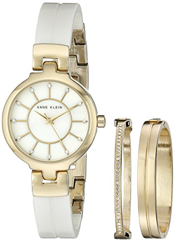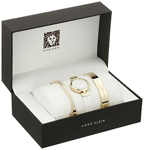 Studio : AK Anne Klein Publisher : AK Anne Klein Binding : Watch Product Description Crystal markers spark the pretty mother-of-pearl dial on this beautiful ceramic-bangle watch. Two additional bangles make this a feminine pre-stacked set. Color(s): white/ gold. Brand: Anne Klein. Style Name: Anne Klein Ceramic Bangle Watch Set, 26mm. Style Number: 1070187. Manufacturer part number AK-2048GBST 26mm case; 12mm band widthJewelry clasp closure Three-hand quartz movement Mineral crystal face Goldtone or rose-goldtone plate/mother-of-pearl/crystal 0