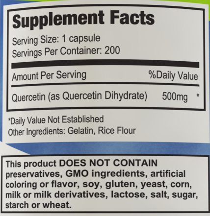 -. Binding : Health and Beauty -. Brand : Nutrissence -. EAN : 0738964850798 -. Feature : SUPPORTS HEALTHY IMMUNE RESPONSE: Quercetin can help stabilize cells that release histamine in the body. / ANTIOXIDANT : Nutrissence Quercetin 500mg contains flavonoids that have strong antioxidant properties. / ANTI-INFLAMMATORY: Quercetin can also act like an antihistamine and an anti-inflammatory / NO PRESERVATIVES & NO GMO - Contains NO GMO ingredients, preservatives, artificial flavor or color, milk, lactose, soy, or gluten. / MANUFACTURED IN USA: Made in the USA in an FDA approved facility following cGMP guidelines. -. Label : Nutrissence -. Manufacturer : Nutrissence -. ProductGroup : Health and Beauty -. ProductTypeName : HEALTH_PERSONAL_CARE -. Publisher : Nutrissence -. Studio : Nutrissence -. Title : Quercetin 500mg 200 Capsules - Nutrissence -. UPC : 738964850798
