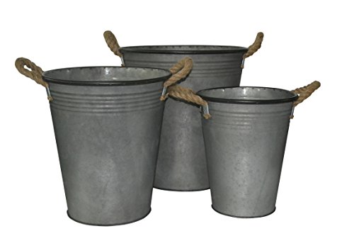 - Set of 3 (large, medium, small) tall, tapered, round galvanized containers with side rope handles and a top ridged pattern and smooth finish