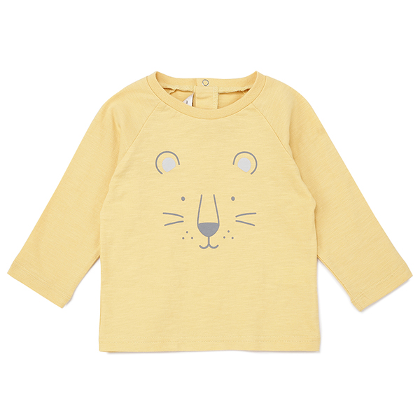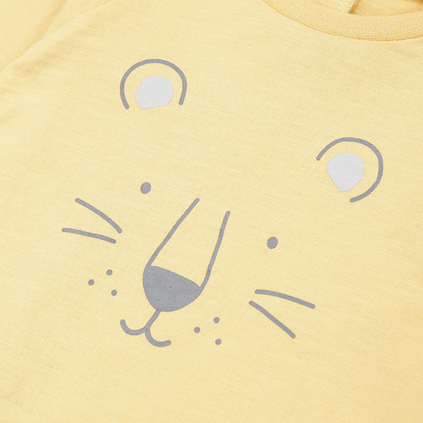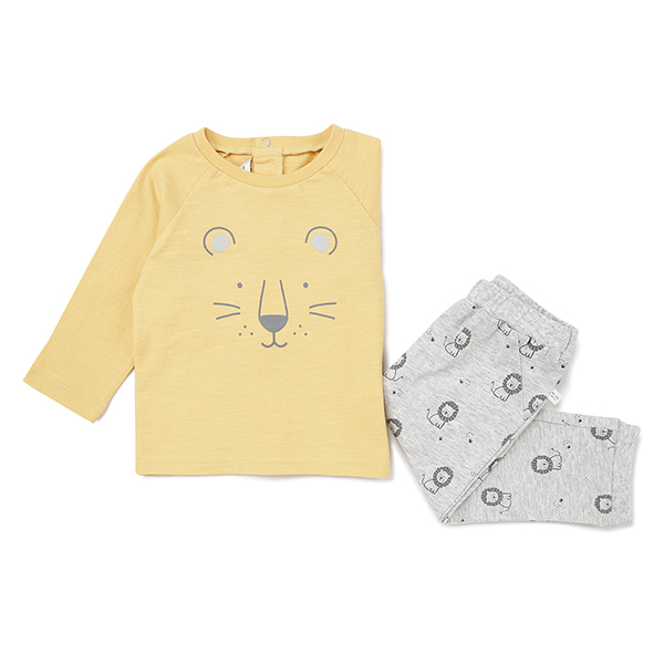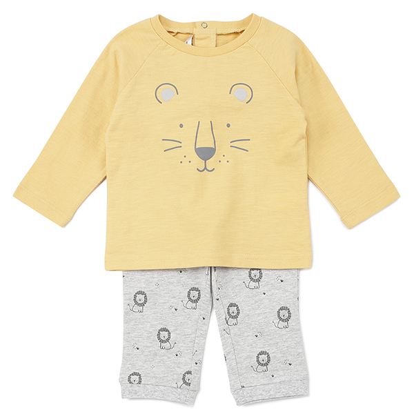 엘로우 컬러의 상의와 멜란그레이 컬러의 하의를 매치한 귀여운 스타일의 상하복입니다. 귀여운 레오나염으로 포인트를 주었습니다.