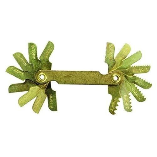 - Metric thread pitch gauge measures the distance between threads in millimeters