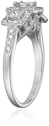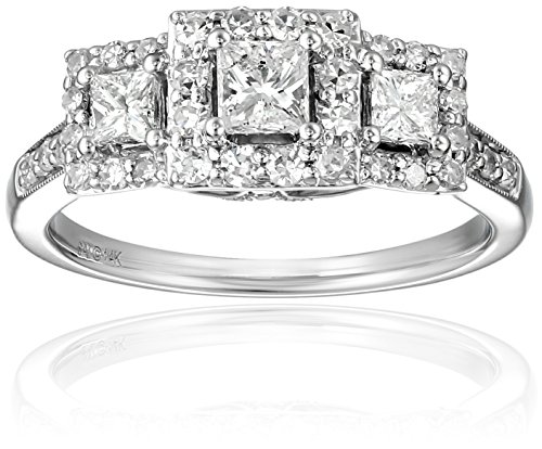 Three-stone engagement ring featuring princess-cut diamonds flanked by pave-set stones