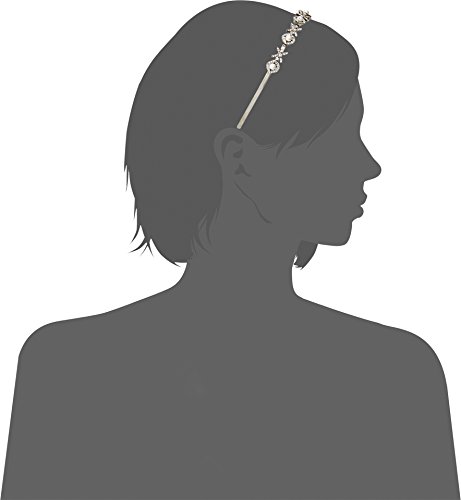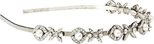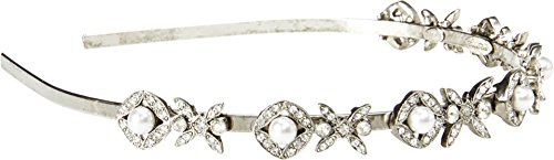Plated pewter brass metal headband with glass crystal and resin pearl accents.