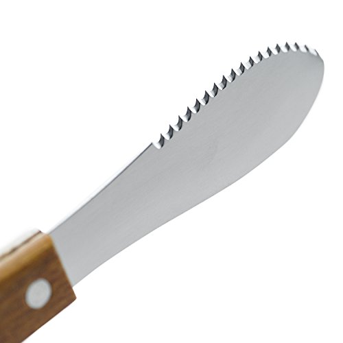 - Ergonomic handle with wooden handle grip, reduces hand fatigue and allows for precision and control. The handle is designed in a way which give adequate leverage and grip with just the right amount of weight. The wide stainless steel straight edge blade saves time when spreading condiments of any kind in seconds.