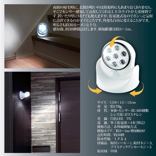 【商品名】LEDマルチセンサーライト 赤外線検知方式 7灯/単3乾電池式 防雨形 (玄関/屋外)
