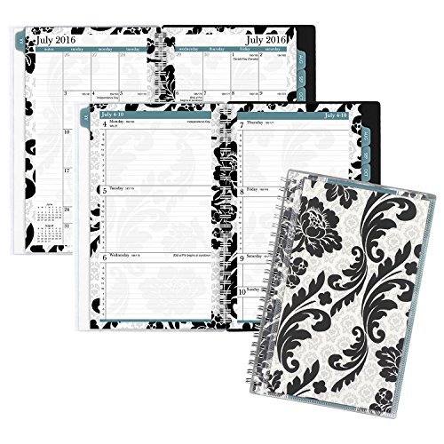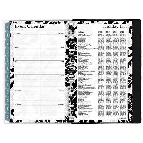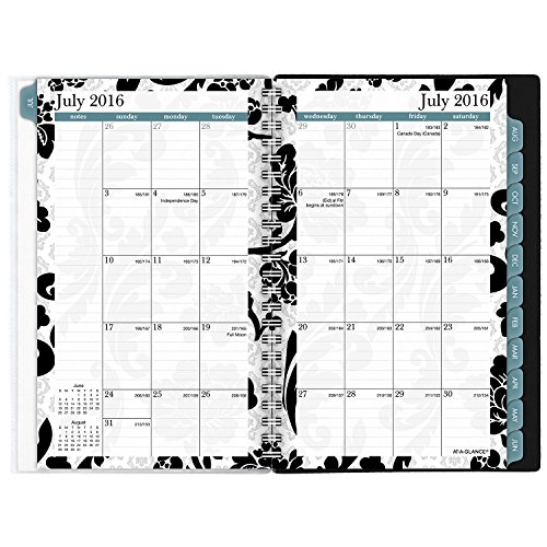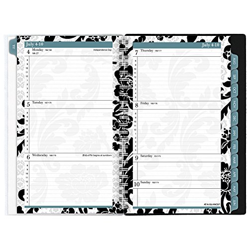 -. Binding : Office Product -. Brand : At-A-Glance -. EAN : 0038576183469 -. Feature : Madrid design is classic black and white floral with teal monthly tabs to add style to your planning and organizing. Clear front sleeve allows customization - just insert your own cover page. / 12 month date range covers a full academic calendar year from July to June. The Perfect planner for teachers, administrators, parent and other professionals used to planning on this time frame. / 1 week per 2 page spread for detailed scheduling. Monday-Friday features hourly appointments from 8:00 a.m. To 5:00 p.m. While Saturday and Sunday are untimed. 1 month per 2 page spread for big picture plans. Ruled daily blocks. 4.88 x 8" page size. -. Label : ACCO Brands -. Manufacturer : ACCO Brands -. Model : 793-201A-17 -. MPN : 793-201A-17 -. NumberOfItems : 1 -. PackageQuantity : 1 -. PartNumber : 793-201A-17 -. ProductGroup : Office Product -. ProductTypeName : OFFICE_PRODUCTS -. PublicationDate : 2016-03-01 -. Publisher : ACCO Brands -. Studio : ACCO Brands -. Title : AT-A-GLANCE Academic Year Weekly / Monthly Appointment Book / Planner, July 2016 - June 2017, 4-7/8"x8" (793-201A) -. UPC : 038576183469