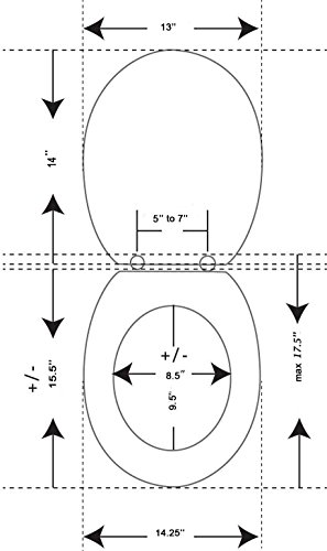 -. Feature : CHECK CAREFULLY THE SIZE NEEDED , this toilet seat is 15.5"L X 14.25"W / Made of MDF (wood), comfortable with 4 bumpers / It has adjustable matching color plastic hinges (2 positions-2 possible lengths) / Round toilet seat, fits all manufacturers' round toilet bowls / four matching plastic bumpers and easy-to-install hinges