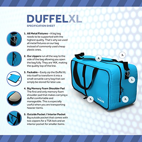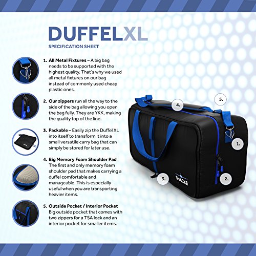-. Brand : Shacke -. Department : unisex-adult (lage only) -. Feature : Extra Large 27 x 16 x 12 inches w/ YKK Zipper that Opens All The Way to The Side of The Duffel for Easy Loading / Super Comfortable Memory Foam Shoulder Pad w/ All Metal Fixture and Clasp (No Cheap Plastic) / Double Zipper on Main and Back Pouch for TSA Locks - Also includes 1 inner pouch / Zip Folds into 13 x 14 inch small pouch for easy storage / Made of thick Nylon with double bottom lining to help increase support - Your Dream Duffel! -. ProductGroup : Apparel -. ProductTypeName : LAGE -. Size : One Size -. Title : Shacke Duffel XL - Large Travel Duffel Bag - Foldable w/ Memory Foam Shoulder Pad