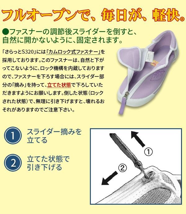 | ファスナーをフルオープンすることができ、毎日軽快にお使いいただけます。ファスナー調節後スライダーを倒すと、自然に開かないように固定されます。 |
