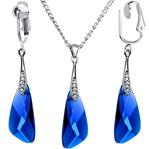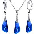 Appear fashion-forward and completely coordinated whenever you wear this earring and necklace set for women. This gorgeous set includes a pendant necklace made with an 18" long stainless steel adjustable chain with a lobster claw closure that features a 1 1/2" beautiful blue crystal dangle pendant as well as a pair of silver plated nonpierced clip on dangle earrings with a blue crystal dangle that measures 2.25" in length. Hand assembled in the USA, this pendant necklace and earrings set is made with Swarovski crystals and is the perfect pre-coordinated jewelry choice for you! Specifications: 18" (457mm) Stainless Steel Adjustable Chain, Lobster Claw Closure, 1 1/2" (38mm) Pendant, Silver Plated 2.25" (57mm) Length Non-pierced Clip On Earrings, Hand Assembled in the USA, Created with Swarovski CrystalsFeature