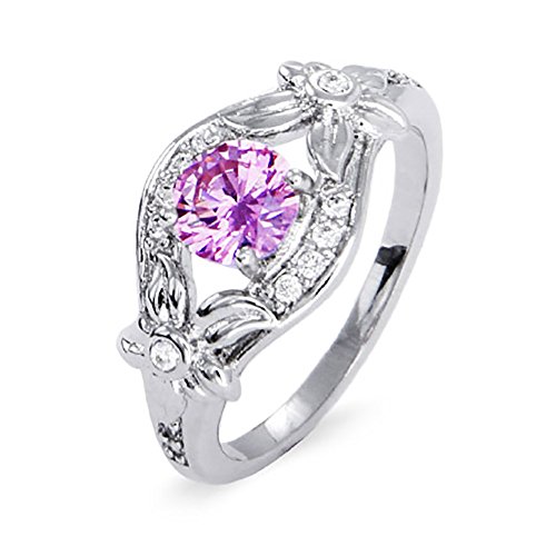 The Silver-Tone CZ Lily Flower Ring is sure to make a personalized statement with the 5mm center simulated stone of your choice. Across from flower to flower this ring measures 3/4 in and 3/8 across the top. There are also lovely accent Cubic Zirconias, two placed to at the ends of the design, as well as one at each center of the flowers, and three sparkling simulated stones above and below the . The band graduates beautifully to 2mm in the back of the ring. Add some sparkle that is all your own with this lovely Silver-Tone CZ Lily Flower Ring.Feature