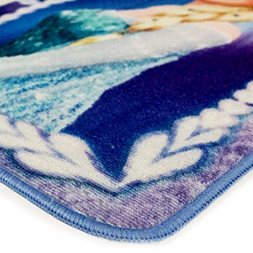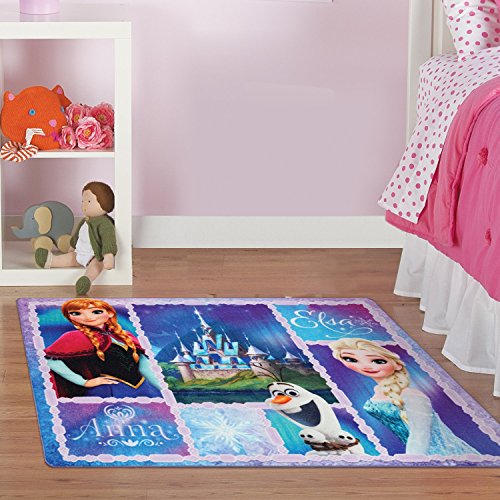 Anna, Elsa, and Olaf are featured on this Frozen inspired digital print area rug. This rectangular area rug measures 40 inches x 54 inches. The back of the rug has non skid gel foam backing. This rug has vibrant colors and being a digital printed rug the design really pops off the rug. Machine woven durability and easy care makes this rug perfect for a kid's room. Digital printed, full color graphic features favorite Disney Frozen characters Anna, Elsa, and Olaf.Feature