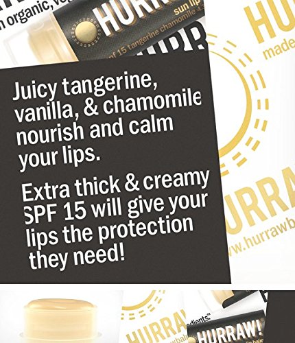 ONE 4.3g/.15oz Oval Tube of SUN Hurraw! Lip Balm. SPF 15. Zinc Oxide Sun Protection with Tangerine and Chamomile. Glides on silky smooth and virtually CLEAR! Made with Premium Organic, Vegan and Raw Ingredients. Hurraw! Balms are Cruelty Free, GMO Free and Gluten Free. Simply, the Best Luxury Lip Balm MADE IN THE USA.