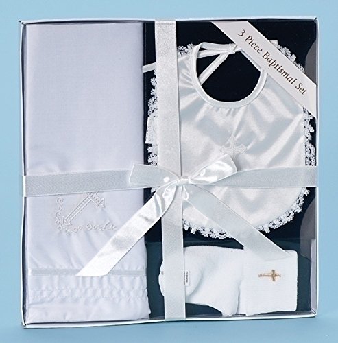 3 PIECE BAPTISM GIFT SET WITH BIB, BLANKET AND SOCKS.