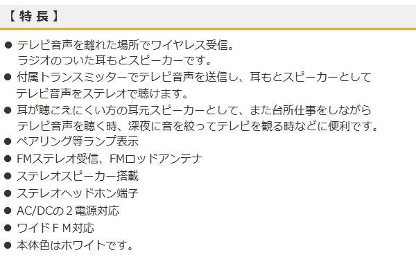 fk094igrjsラジオのついた耳もとスピーカーです耳が聴こえにくい方の耳元スピーカーとして、また台所仕事をしながらテレビ音声を聴く時、深夜に音を絞ってテレビを観る時などに便利です サイズ 個装サイズ:27×20×10cm 重量 個装重量:1270g 生産国 中国 ラジオのついた耳もとスピーカーです ラジオのついた耳もとスピーカーです耳が聴こえにくい方の耳元スピーカーとして、また台所仕事をしながらテレビ音声を聴く時、深夜に音を絞ってテレビを観る時などに便利です