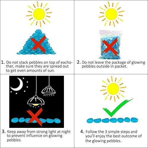 - GLOW IN DARK: These pebbles can absorb sunlight during the day and light up at night. which can glow lasting for several hours after normal daylight exposure