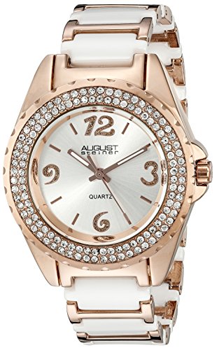 This bold women's timepiece by August Steiner features a highly polished case with a rose gold tone finish and double rows of crystals studded into the bezel! The black dial is home to crystal-filled Arabic numeral and baton markers, and the classic three-hand indication is powered by a highly accurate and reliable quartz movement. The case is adorned with a white ceramic and steel link bracelet.Feature