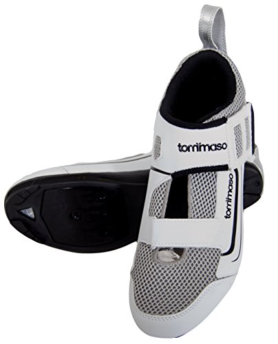 -. Brand : Tommaso -. Color : White -. Department : Mens -. Feature : Best value performance triathlon shoe on the market. The Veloce 100 blends comfort and performance together, creating an amazing triathlon shoe to help riders achieve their best times / Supple synthetic leather upper hugs foot, and is specially designed to be worn with socks or barefoot. / Open tongue with ultra-ventilated mesh portions, are perfect for drying feet after the swimming portion of your race / Fiberglass reinforced polyamide sole offers optimal stiffness, increasing performance and maximizing power transfer / Compatible with SPD-SL cleats and other 3-bolt systems -. Label : Tommaso -. Manufacturer : Tommaso -. ProductGroup : Sports -. ProductTypeName : OUTDOOR_RECREATION_PRODUCT -. Publisher : Tommaso -. Studio : Tommaso -. Title : Tommaso Veloce 100 Triathlon Road Cycling Shoe