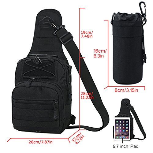 -. Feature : TACTICAL BAG + BOTTLE POUCH: Fitmall bag can be used as chest bag, cross-body bag, handbag, and daypack. A detachable pouch matches it for holding your bottle or umbrella. Perfectly fit all your taste when hiking, camping, fishing, climbing, cycling etc. / MATERIAL: 1000D high density nylon shell + mercerized cotton + thicken shockproof sponge. Scratch resistant, wearable sewing, and breathable quality. / DIMENSIONS: 20 X 12 X 28cm( L x W x H). The large main pocket can hold Ipad air(9.7"), and the back thicken sponge pocket can hold ipad mini 4(7.9"). The water bottle pouch: 8 x 16cm(D x H) / STRUCTURE: There are one large-space compartment with two interior slot pockets, two front zipper pockets and one interior open pocket, one shoulder pocket, one back thicken pocket with an interior net pouch. / MOLLE SYSTEM: There exist lots of Molle system design on front, side and shoulder parts. So you can attach other small bottle and extension bags, or hang your sunglasses and interphones.