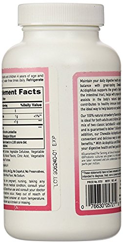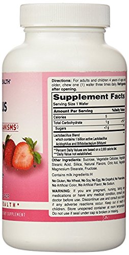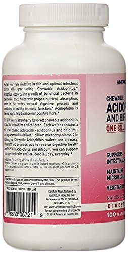 -. Binding : Health and Beauty -. Brand : American Health -. Color : Parent -. IsAdultProduct : 0 -. Label : American Health -. Manufacturer : American Health -. PackageQuantity : 1 -. ProductGroup : Health and Beauty -. ProductTypeName : HEALTH_PERSONAL_CARE -. Publisher : American Health -. Studio : American Health -. Title : American Health - Acidophilus Chewable, 100 wafer
