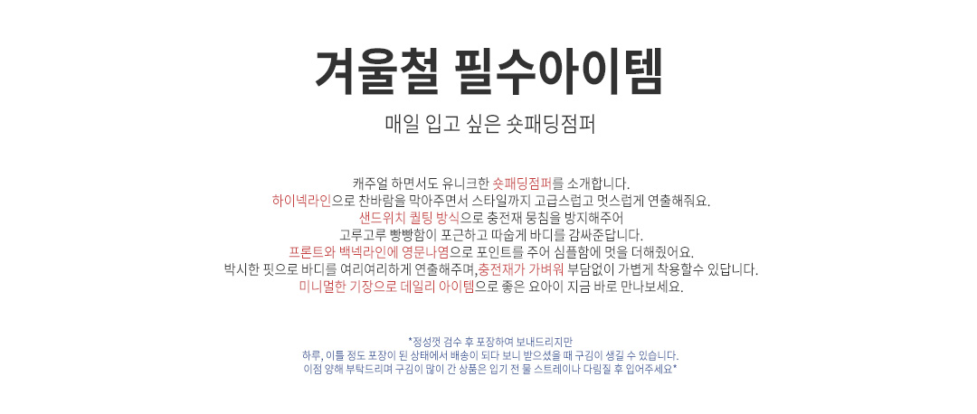 | 소재(Material) | 폴리에스테르(polyester/)100%안감폴리에스테르(polyester/)100%충전재(Filler/)솜(cotton/)100% | |