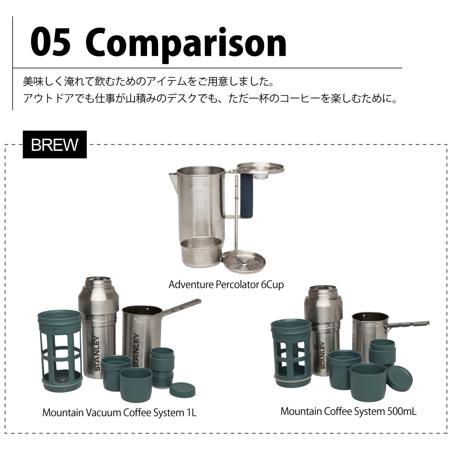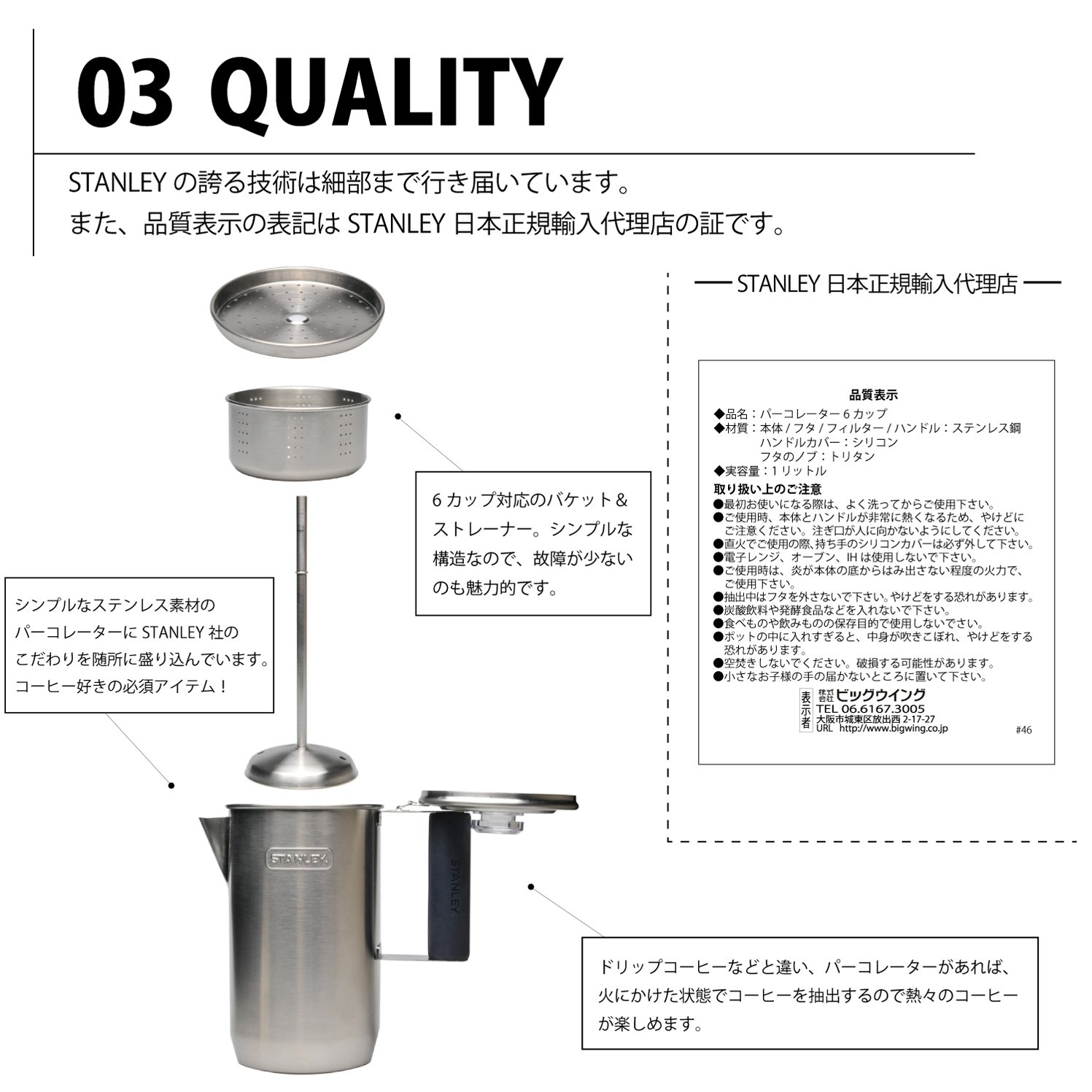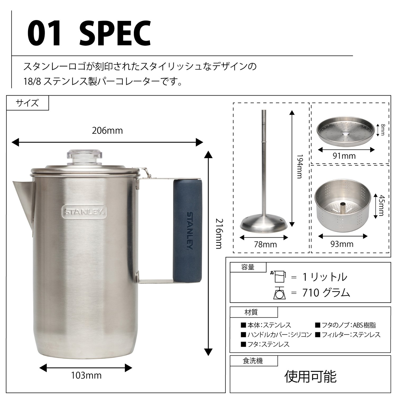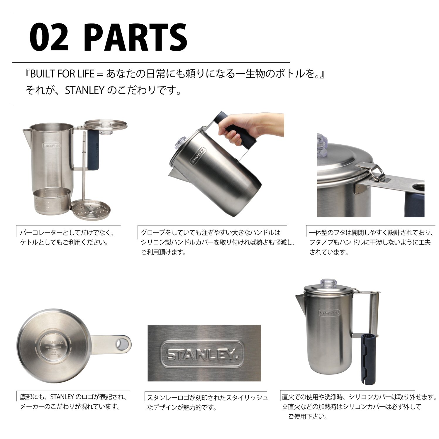 ● 18/8 stainless steel percolator with stylish design stamped with a stanley logo.