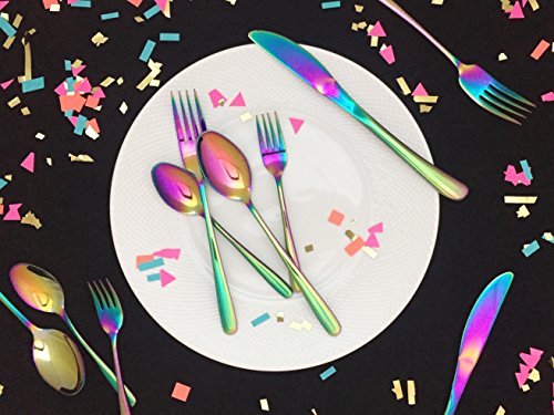 Product Description 20-Piece Iridescent Rainbow Stainless Steel Flatware Set. Perfect for colorfully modern homes, partyware, college apartments, and more! Order for your next event-from weddings to mermaid or unicorn birthday parties, to a styled photo shoot, this kaleidoscopic dining set makes a tablescape statement. Dishwasher safe. ***Because of the handcrafted and artistic nature of this item, color variations are possible and may vary from photography online. Please note that hints of silver stainless may shine through the rainbow finish. 0