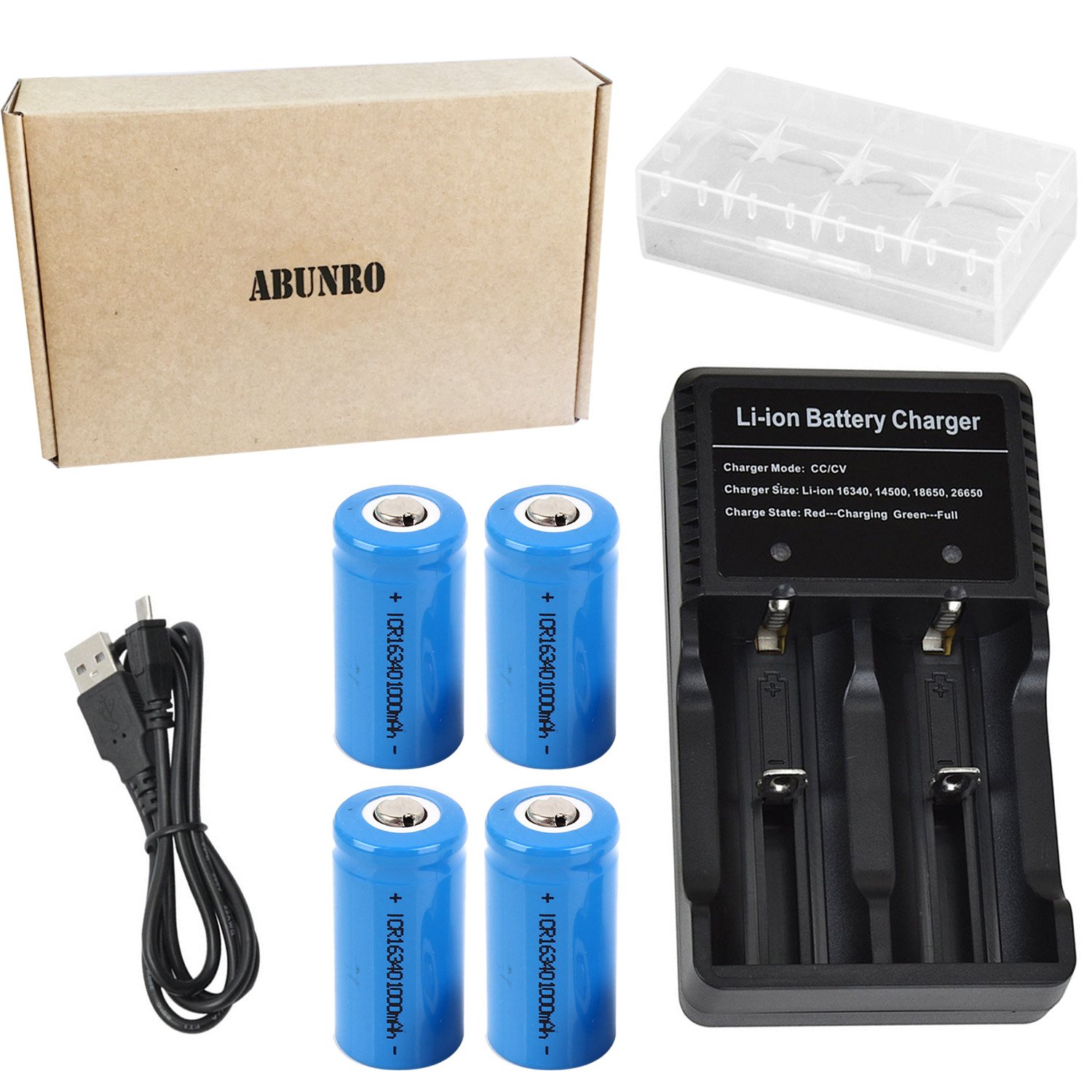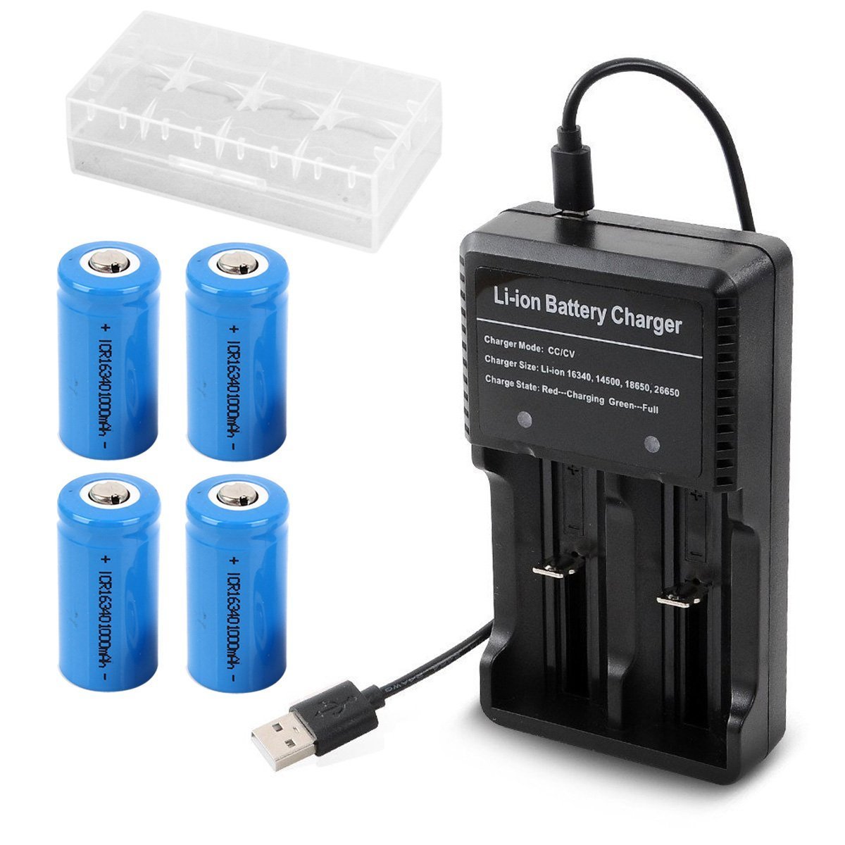 ★ Packing specifications: 16340 3.7 V Li-ion battery 4 pieces, charger 1 piece, USB charging cable 1 piece Battery storage case 1 piece