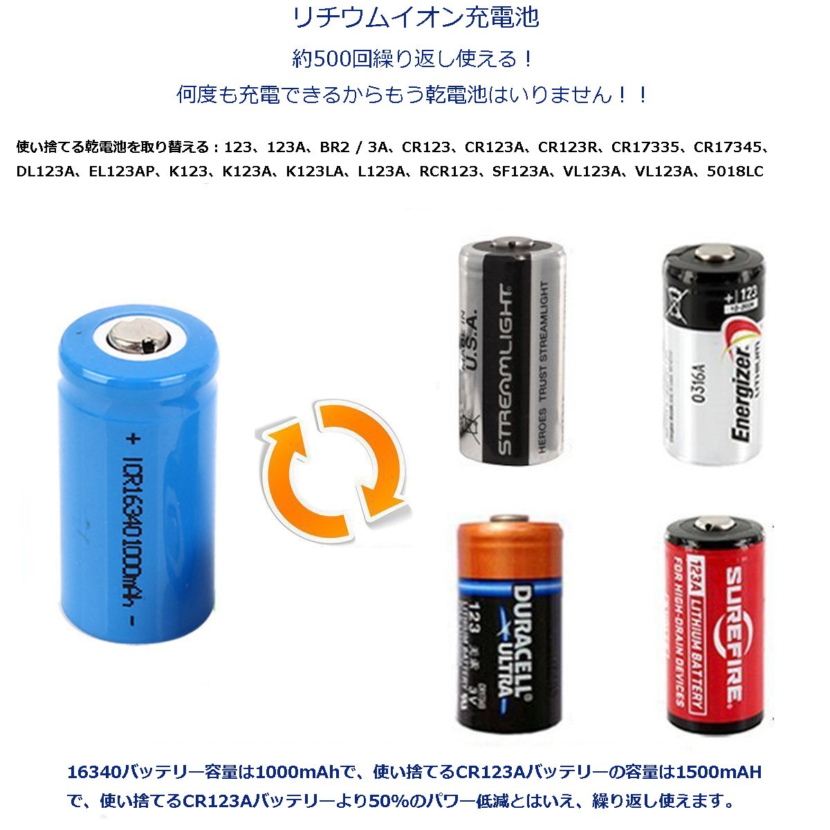 ★ High capacity rechargeable type 16340 can be used repeatedly.