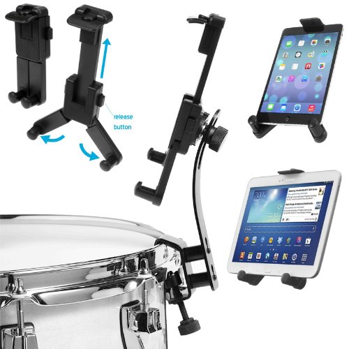 -. Feature : Brand New in ChargerCity No Fuzz No Mess Packaging (Original ChargerCity Direct Replacement Warranty) / Tablet holder supports any iPad or 7"-10.1" tablets, Cellphone Holder supports cellphone width from 2 to 3.7 inches / 360-degrees rotatable holder perfect for comfortable reading or watching videos. / Drum Clip mount Fits 6 18 diameter drums with rims as tall as 1 3/8 / Works with most flanged, die-cast, and percussion rims. Also has Height adjustable design locks in any position