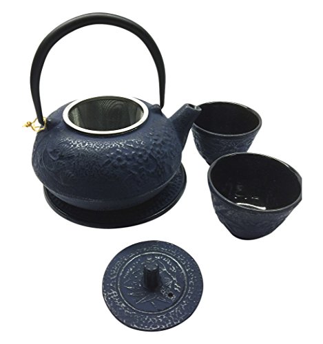 -. Feature : This cast iron tea set includes: One teapot (18 oz.), two teacups, one trivet / Stainless steel teapot strainer included, enamel coating to prevent rusting / Dimension: Teapot: 5 in diameter x 4 in H, teacup: 2-7/8in diameter x 2in H x trivet: 5-1/2in sq. x 3/4in / Capacity: Teapot: 18 fl.oz., teacup: 3.5 fl.oz. / Stainless steel teapot strainer included