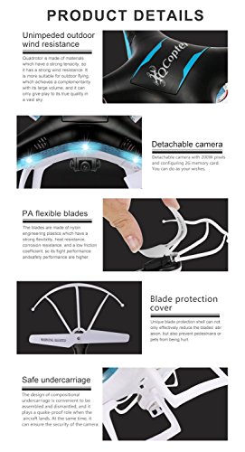 Great Store Drone product with all the extras. Battery * * Extended Extended Flight Time with 2 Upgraded Batteries. LED lights on this drone lights up at night. Stability of flight makes it easy for beginners and better control over drone. HD camera allows for Birds Eye photos. Lots of fun for the whole family. FAQ: 1-What if my Drone is not hovering properly, or Drifting to the side? Reset the drone Drone Factory values by turning the remote control and power on. Then move the left lever to the lower left corner of the driver and the right Joystick to the lower right corner at the same time. The Drone light should blink indicating that the drone has Reset. The 2 small joystick buttons below the right adjust the drone trim to stabilize the drone. 2-how do I control the speed of unmanned aircraft? Button on the top left of the Speed Demonstration controls the driver speed with demo1 being normal mode, demo 2 is more speed and 1/2 the fastest speed. 3-how do I Connect / Drone driver and sync together? The Drone synchronizes with the driver by moving the left joystick up and then down on the driver and the propellers will do Engage and spin. 4- Should I install the prop guards and screws? Yes the prop guards protect the gears and motors and should always be installed. 5- How long should I drone the batteries and long is the flight time charge for each battery? About 2 hours to 15 minutes of charge flight time per battery charge. It does not overload. 6-what if one of the propellers are not spinning correctly? See answer to question # 1 for resetting the unmanned drones by factory default. If this does not work please contact the seller for spare parts. 7- WHERE do I get spare parts? Please contact the seller at Mike 8- How to install and operate the camera? Plug the 3-pin connector into the drone and camera clip on the bottom of the Drone.