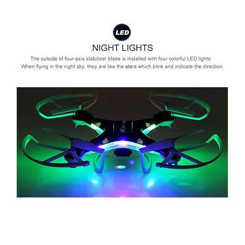BRILLIANT DRONE COLORS AND LED LIGHTS - Metalic-colored RC drones are custom designed. Awesome colorful LED lights on flying drone provide night illumination. RC Helicopter Quadcopter drone lights will WOW your family, friends and neighbors. Watch the night light show!