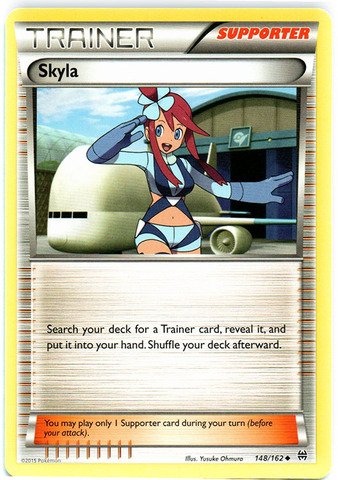 -. Binding : Toy -. Brand : Pokémon -. Edition : XY BREAKthrough -. Feature : A single individual card from the Pokemon trading and collectible card game (TCG/CCG). / This is of Uncommon rarity. / From the XY BREAKthrough set. -. IsAdultProduct : 0 -. ItemPartNumber : 148/162 -. Label : Pokemon USA, Inc. -. Manufacturer : Pokemon USA, Inc. -. MPN : Pokemon -. PackageQuantity : 1 -. PartNumber : Pokemon -. ProductGroup : Toy -. ProductTypeName : TOYS_AND_GAMES -. Publisher : Pokemon USA, Inc. -. Studio : Pokemon USA, Inc. -. Title : Pokemon - Skyla (148/162) - XY BREAKthrough