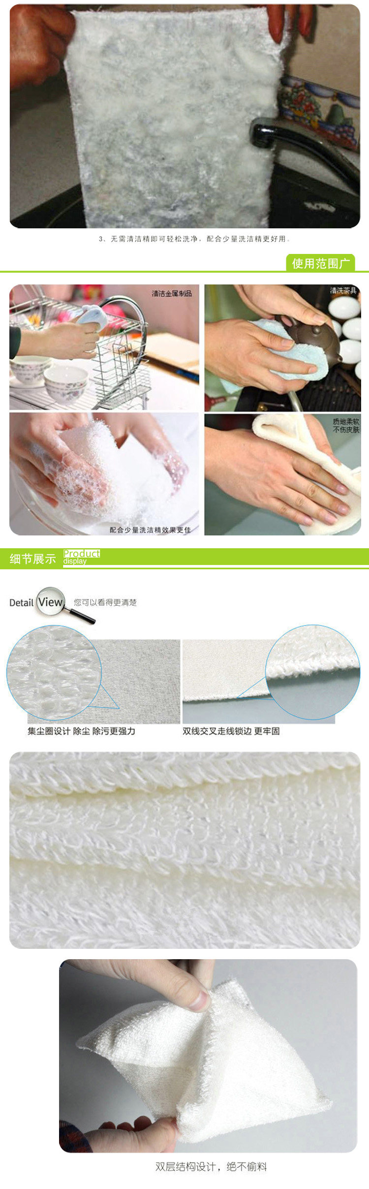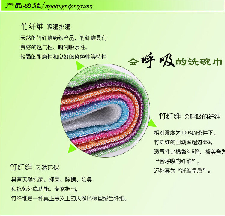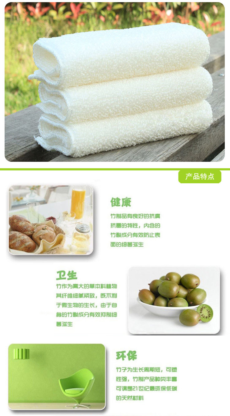 材质:全竹纤维,我们的洗碗巾不是涤纶+竹纤维的混纺,是100%全竹的,掺杂涤纶的洗碗巾容易沾油、发黏、不易清洗。