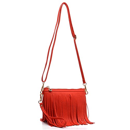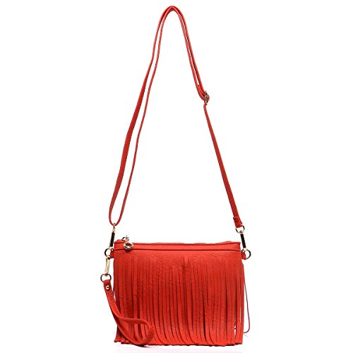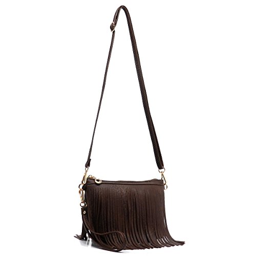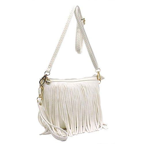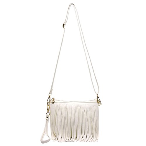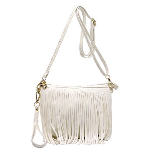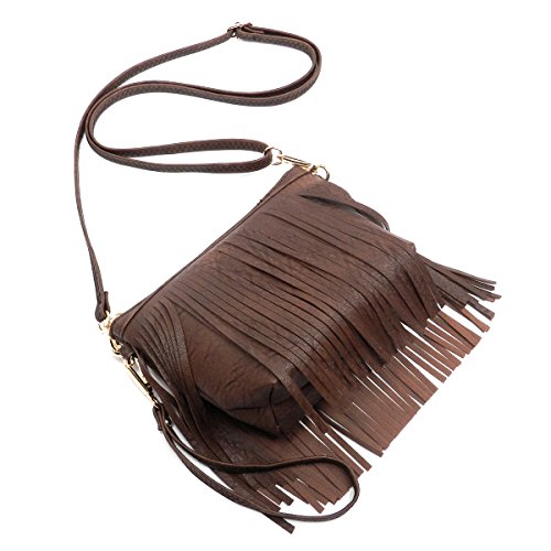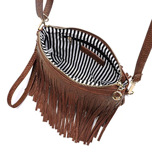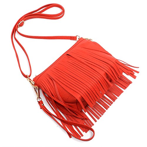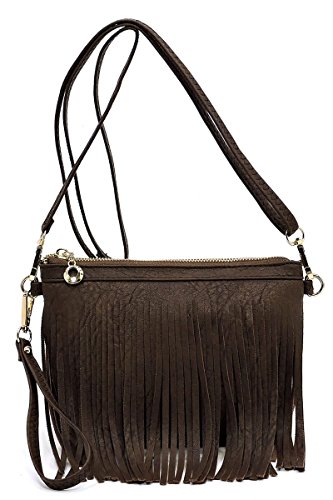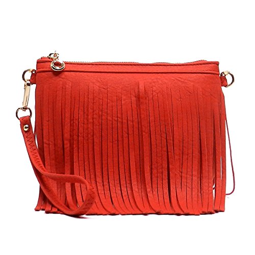 Product DescriptionFringe Wristlet Cross body Bag. Leather like material. Gold-tone hardware. Zip top closure. Adjustable shoulder strap (24~48"). Detachable Wrist band. Quality polyester fabric lining interior. Interior lining with a back wall zip pocket. Measure 8.5" length, 3" width, 6" height.0