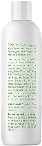 -. Feature : 100% PURE AND NATURAL: Our Aloe Vera Gel is 100% Natural, containing 99.75% Organic Aloe Vera Gel; No Added Color, Fragrance, or Alcohol. / CONTAINS VITAMIN C: Our Organic Aloe Vera Soothes and hydrates dry, itchy, or irritated skin; great for Acne treatment, Dandruff treatment, Scalp Itch, Insect Bites, Sun burn treatment, Razor Burn, and Rashes. / GREAT FOR PERSONAL USE, HOME, AND PETS : Use as an after shave or leave in conditioner; also great for pets / NATURAL CONSISTENCY: Our thin gel absorbs quickly with no sticky residue, leaving skin silky and smooth. It has a serum-like consistency. / MADE IN USA: Our Organic Aloe Vera Gel is made in the USA in a FDA Approved and GMP Certified Manufacturing Facility, and is Paraben Free and Cruelty Free.