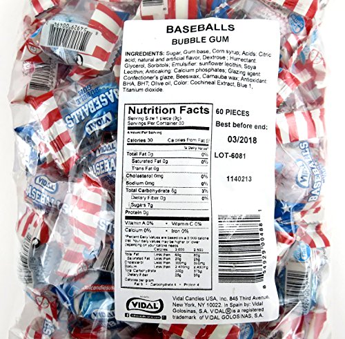 -. Binding : Misc. -. Brand : Black Tie Mercantile -. EAN : 0651818998319 -. Feature : Includes sixty 0.3 oz packets of Vidal Baseballs Bubble Gum / Gluten Free, Fat Free / Product of Spain / In a BlackTie Box -. IsAdultProduct : 0 -. Label : Black Tie Mercantile -. Manufacturer : Black Tie Mercantile -. NumberOfItems : 60 -. PackageQuantity : 1 -. ProductGroup : Grocery -. ProductTypeName : GROCERY -. Publisher : Black Tie Mercantile -. Studio : Black Tie Mercantile -. Title : Vidal Baseballs Bubble Gum, 0.3 oz Packets in a BlackTie Box (Pack of 60) -. UPC : 651818998319