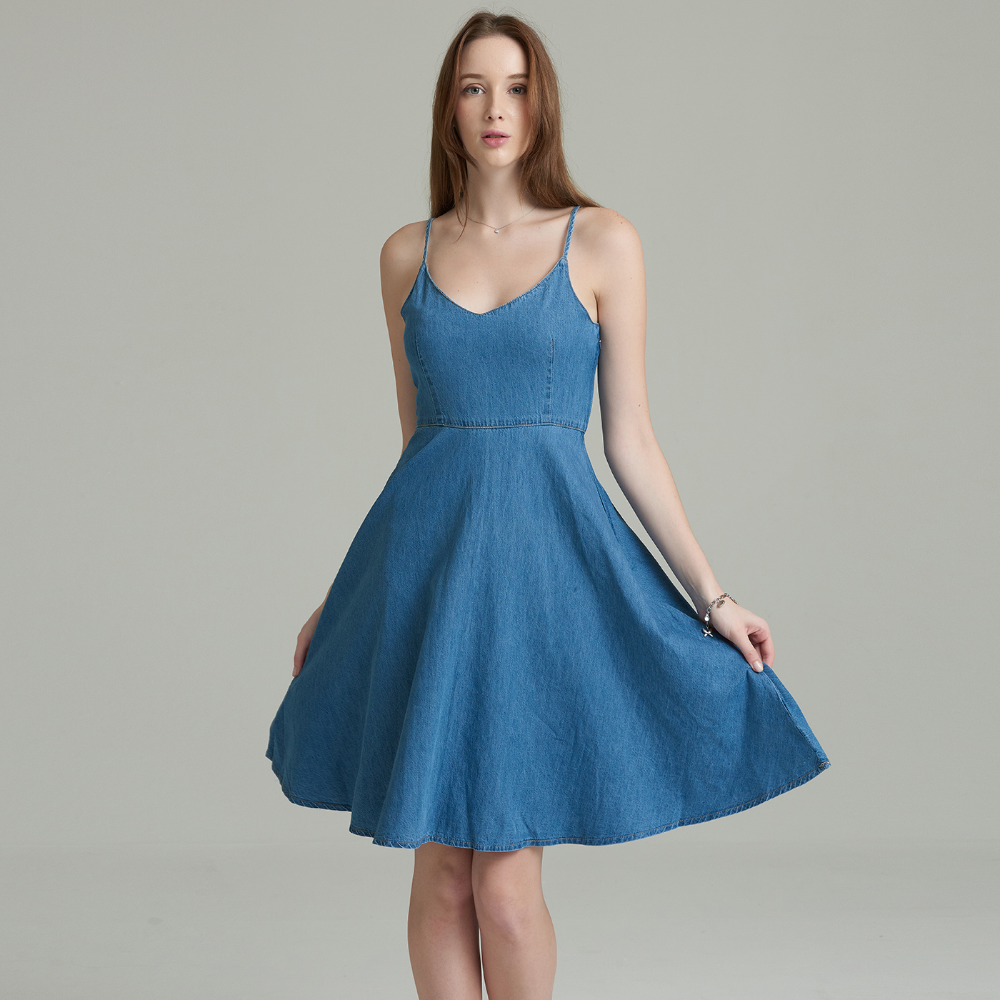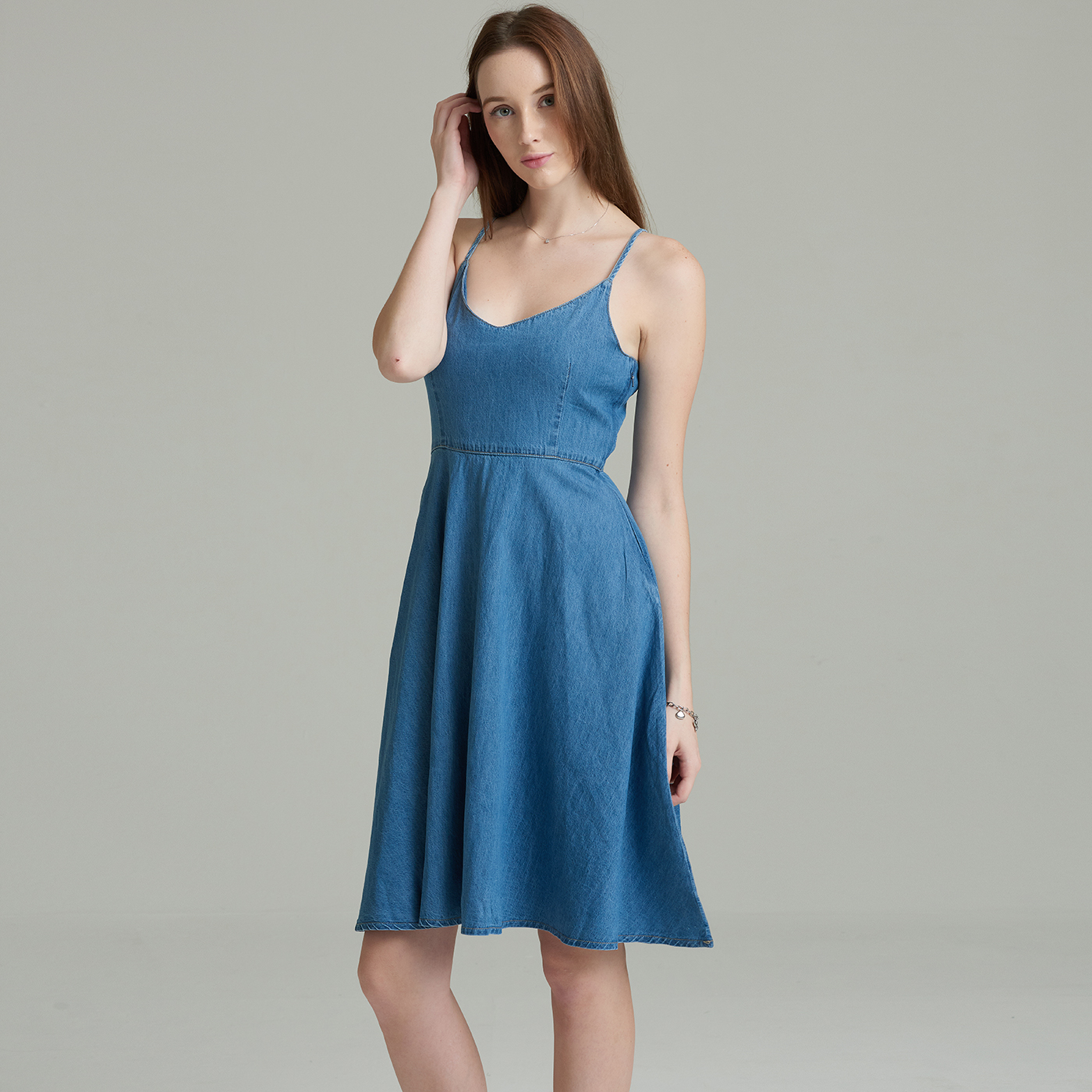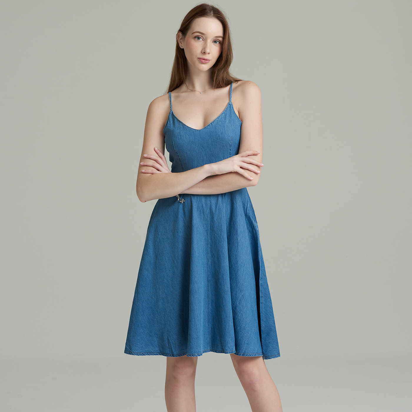 슬림한 플레어 스타일의 데님 원피스입니다.