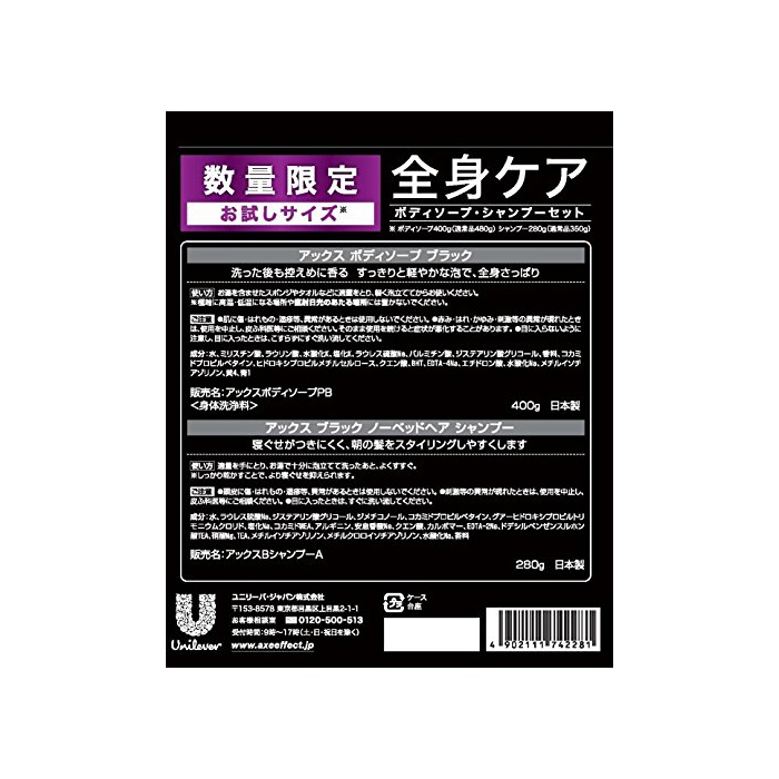 원본상품명: アックス ブラック トライアルポンプペア (シャンプ? 280g + ボディソ?プ 400g) (ク?ルマリンのさりげない香り)